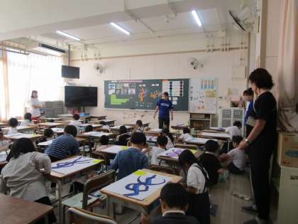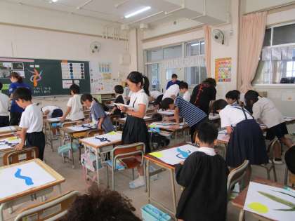 国語で学習した「モチモチの木」をもとに絵を描いています。前時におつきさまを描いて太い幹を描いた絵に、えだを描きました。「筆の動きをコントロールしながら、色や形を工夫して表現しよう」をめあてに筆の使い方を工夫しながら丁寧に描いていました。色づくりも工夫し太い枝から」中くらいの枝、細い小枝と両手を広げたようになるよう描き進めていきました。最後に「楽しかった」「めあてを意識してがんばれた」との感想が聞かれました。一人一人の思いがこもったモチモチの木が仕上がるのが楽しみです。