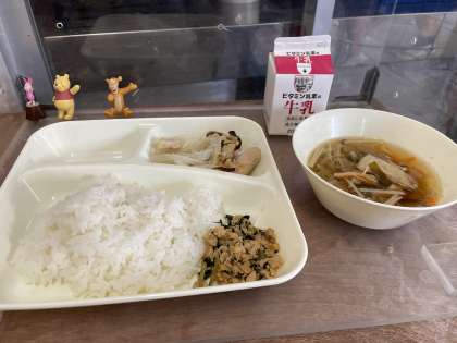 今日の給食は、鶏肉のゆず塩焼き、ソーキ汁、ツナ大豆そぼろです。