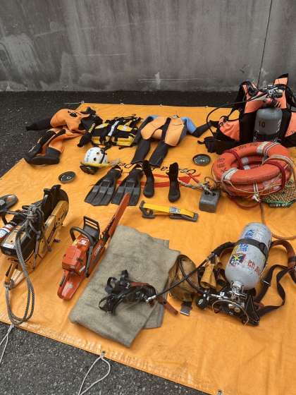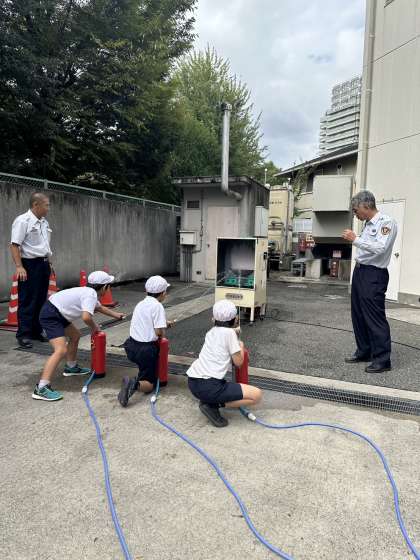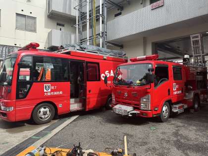 火事に関する動画を見てから、消防車や道具を見せていただきました。