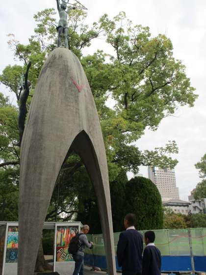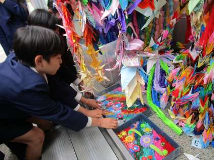 慰霊祭では、原爆の子の像の前で平和を誓い、全校で折った鶴を献納しました。