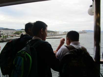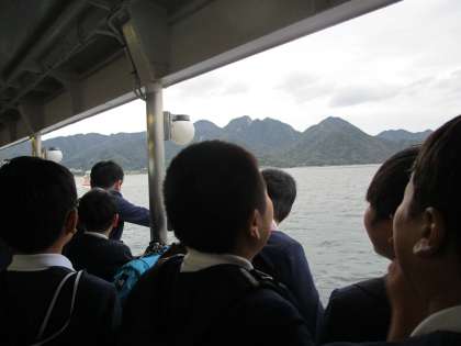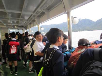 本川小学校を後にして本川町電停から広電で宮島口へ向かい、フェリーで宮島に渡りました。フェリーの上では気持ちよい風を受けながら大喜びの子どもたちでした。うれしくて歌を歌いだし、大合唱になりました。