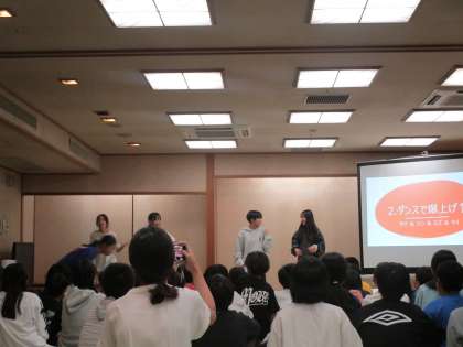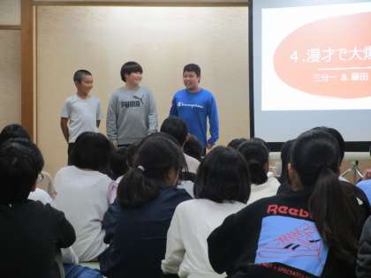 いよいよお待ちかねの夜のレクリエーションの時間です。ダンスあり、誰でしょうクイズあり、漫才ありと楽しいひと時を過ごせました。漫才の中にはすごいサプライズもあり盛り上がりました。楽しむときはしっかり盛り上げて思いっきり楽しめる子どもたちです。今日も大盛り上がりでした。