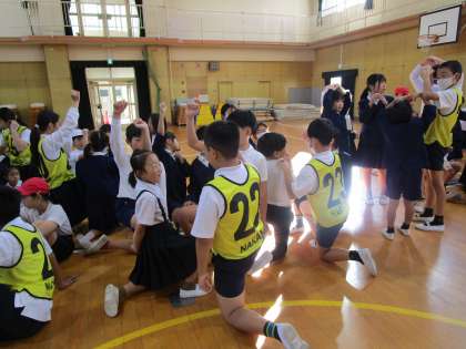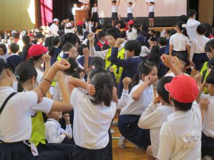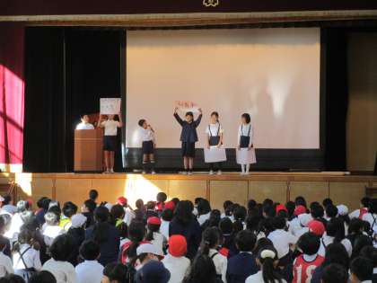 今日のたてわり集会は、6年生が修学旅行だったので、5年生でがんばって企画した「万博にまつわるクイズ」でした。「開幕日の天気は?」「1年生が行ったパビリオンは?」「ミャクミャクも目の数は?」「6年生が献納した鶴と一緒に入れたミャクミャクの数は?」という問題でした。一番と思う人は、大屋根リングを見立てて手をつなぎ、2番だと思う班はガンダムポーズをし、3番はミャクミャクの目のように手を丸くしてつながりました。答えは、子どもたちに聞いてください。