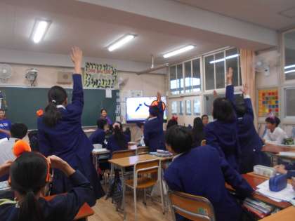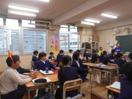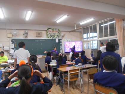 今日は、ハロウインなのでハロウインにまつわるクイズと今まで学習したことをクイズを班対抗としました。正解したらキャンディもらって競いました。大盛り上がりでした。