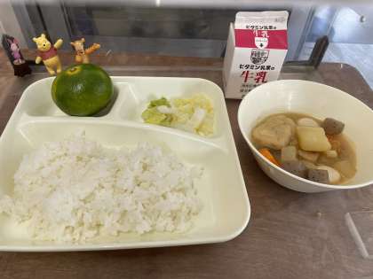 今日の給食は、関東煮、はくさいの甘酢あえ、みかんです。