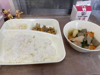 今日の給食は、鶏肉と野菜の煮もの、じゃこ豆、かぶのゆず風味です。