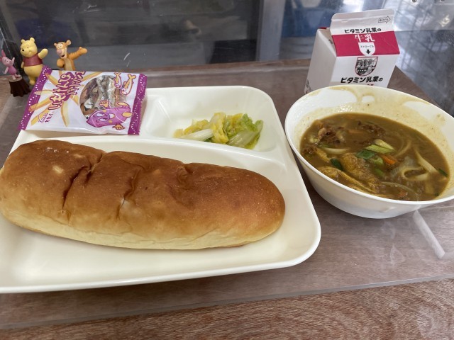 今日の給食は、カレーうどん、はくさいのおひたし、いもけんぴフィッシュです。