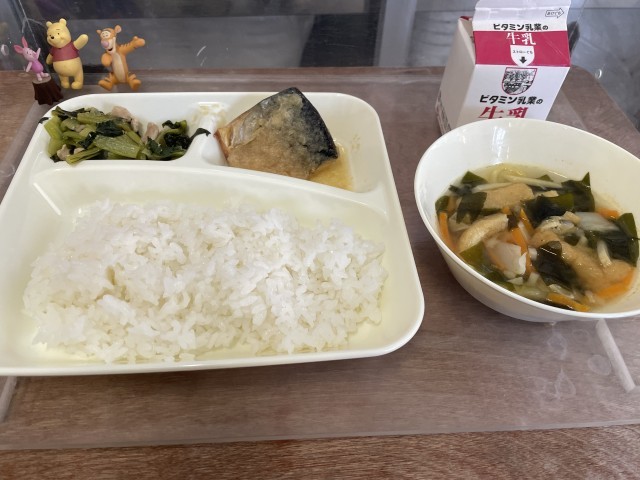 今日の給食は、さばのおろしじょうゆかけ、五目汁、こまつなの煮びたしです。