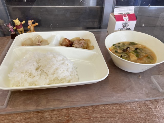 今日の給食は、鶏肉の甘辛焼き、みそ汁、だいこんの煮ものです。