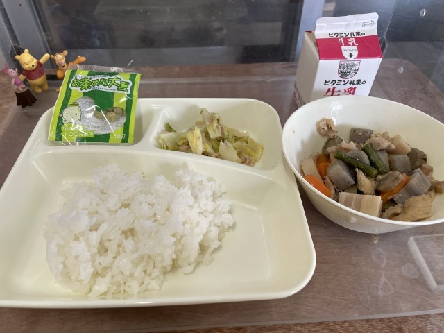 今日の給食は、ケチャップ煮、ささみと野菜のソテー、まっ茶大豆です。