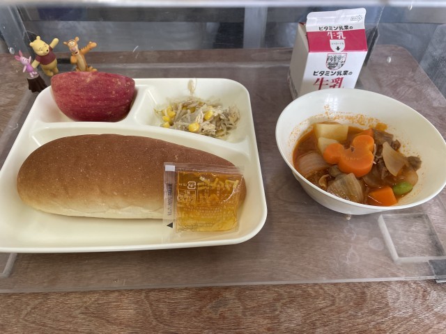 今日の給食は、ケチャップ煮、ささみと野菜のソテー、りんごです。