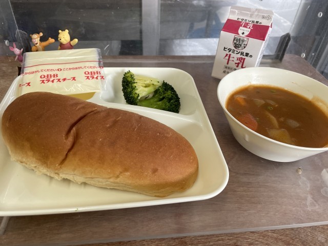 今日の給食は、ビーフシチュー、ブロッコリーのサラダ、スライスチーズです。