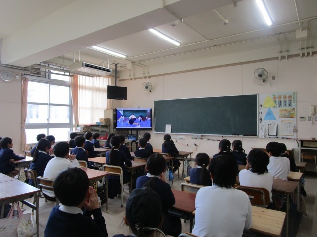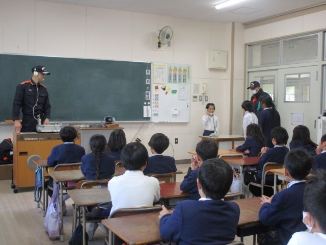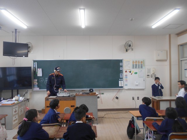 3年生は、地震のビデオを見て、消防署の方に119番通報の仕方を教えていただきました。