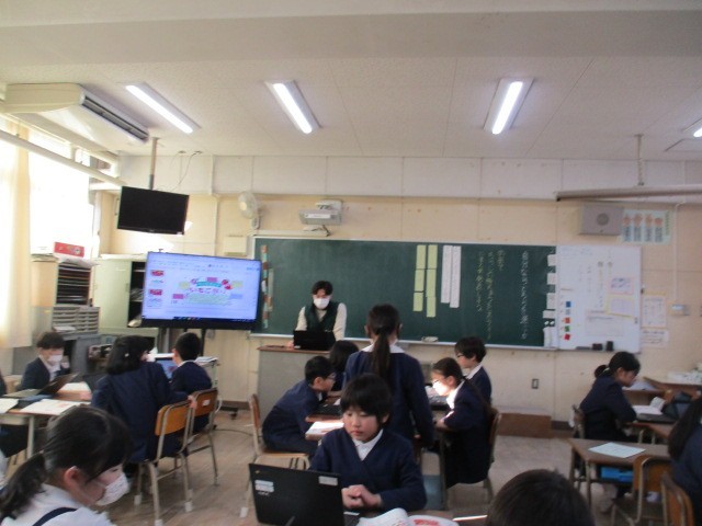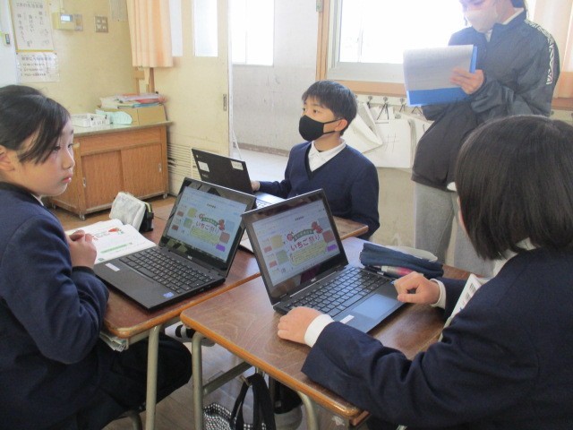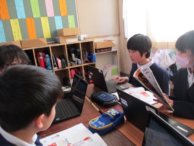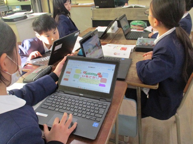 今日の国語は、「自分なら、どっちを選ぶか」という単元を学習しました。めあては「ちらしの特ちょうをスライドにまとめ、発表しよう」です。商店街のいちご祭りの二枚のちらしのどちらがふさわしいかを決め、理由とともに最後は意見文を書きます。今日は、班の人とそれぞれの特徴を見つけて話し合い、スライドにまとめて、班ごとに発表して全体で共有しました。