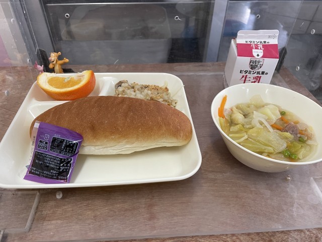 今日の給食は、押麦のグラタン、スープ、いよかんです。