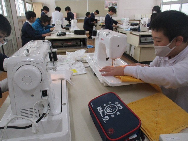古タオルで雑巾を縫っています。学習したことを生かして針を刺したまま角まげて縫ったり、縫い始めは、返し縫いをしたりと友だちと教えあいながら学習を進めていました。下糸を友だちのために作っている子たちもいました。