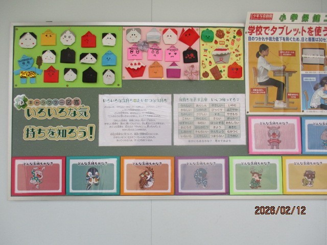 毎月季節に合わせて保健室の上田先生が掲示板に掲示してくださっています。1月は健康おみくじでした。みんな挑戦しましたか?今月は、「いろいろな気持ちを知ろう」という題で、こころについての掲示がしてあります。いじめ・いのちについてを考える日にもお伝えしましたが、決して一人で悩むことがありませんように。