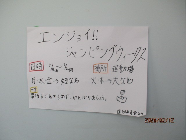 運動委員会の企画で、来週ジャンピングウイークスを行います。毎日20分休みに短なわやクラスで大なわに挑戦します。短なわ忘れずに持ってきてくださいね。