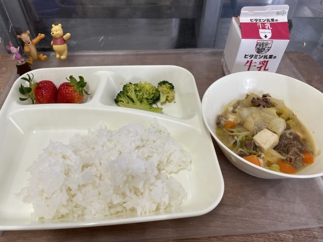 今日の給食は、すき焼き煮、ブロッコリーのしょうがづけ、いちごです。