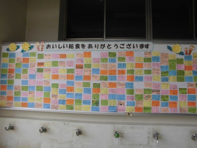 給食週間に給食調理員さんへ感謝の言葉を書いて贈りました。給食室と職員室横の廊下に掲示しています。また、ご覧ください。