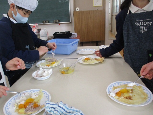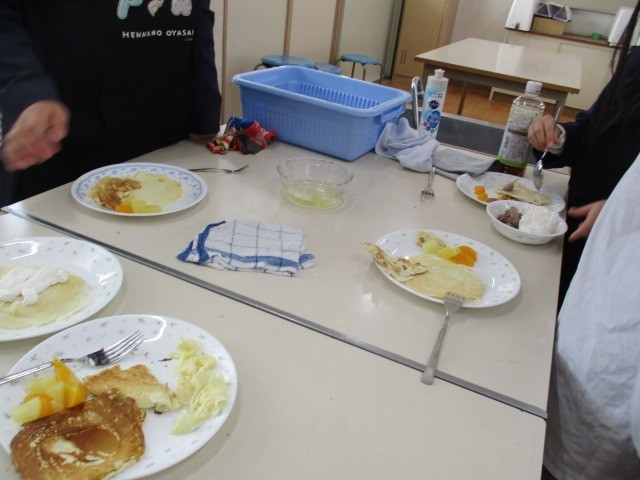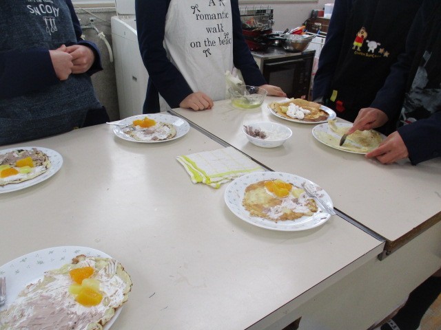 焼けた生地にホイップクリームとフルーツを乗せて包みます。みんな笑顔です。職員室も今日もおすそ分けです。