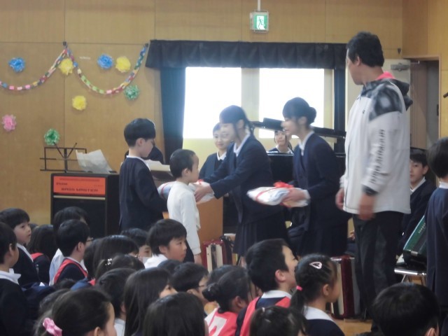 その後、家庭科で縫った雑巾を在校生のみんなと先生方にプレゼントしました。