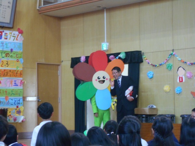 次に、校長先生のお話ですが、現れたのは中野小学校のキャラクター「きずなちゃん」です。