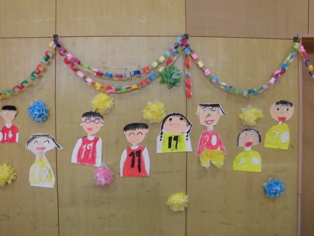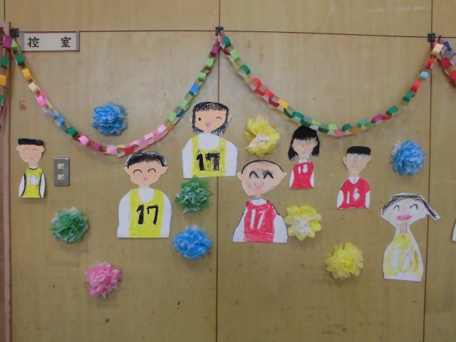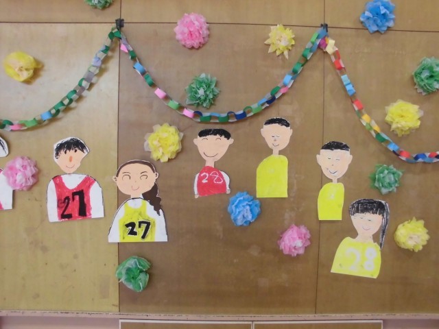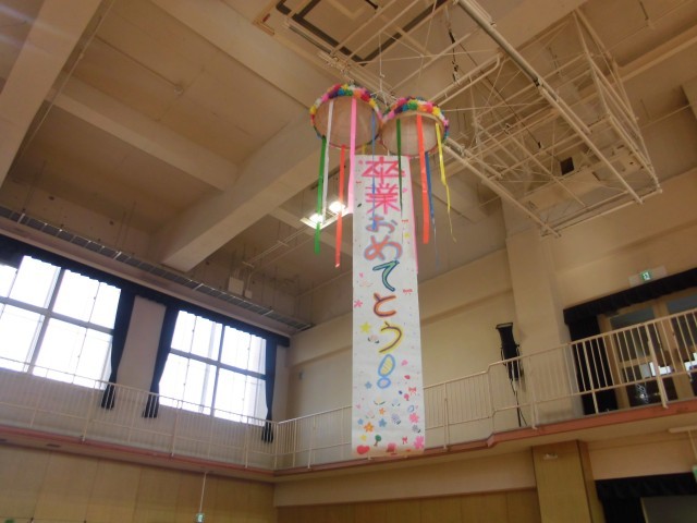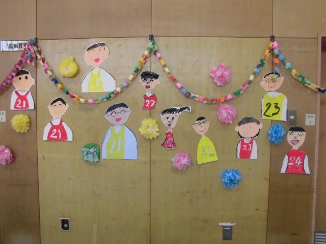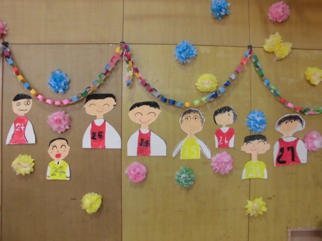 みんなが作った飾りや6年生の似顔絵も卒業お祝い集会に花を添えていました。