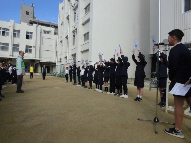 各学級の代表1人が前に出て「まいにちありがとうございました」という文字を掲げ、代表して6年生が感謝状を渡しました。