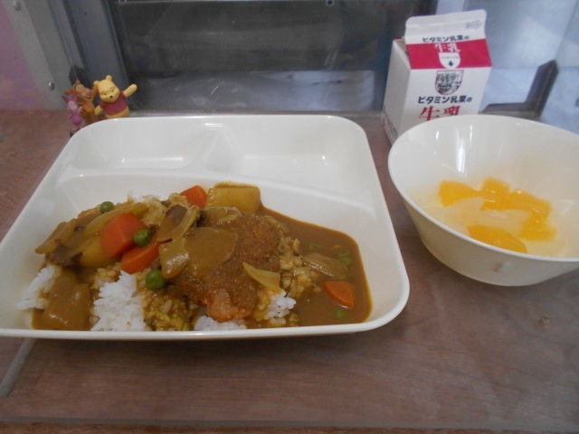 今日の給食は、カツカレーライス、フルーツゼリーです。