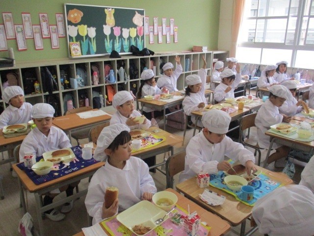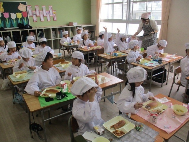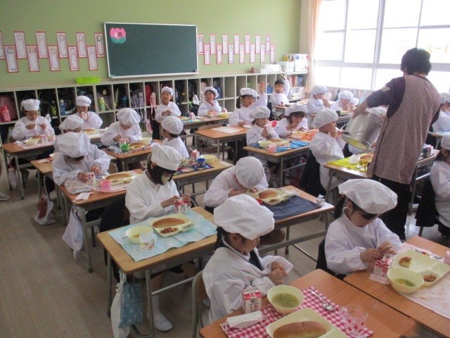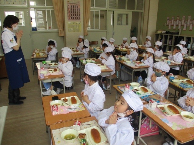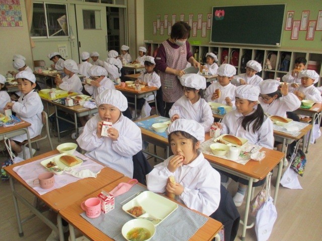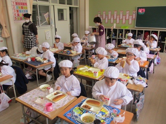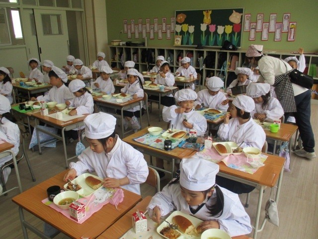 給食が始まって3週目となり、1年生の子どもたちも小学校の給食にすっかり慣れてきました。