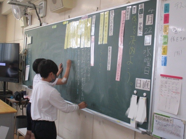 という議題で、クラスの係活動についてみんなで意見を出し合います。