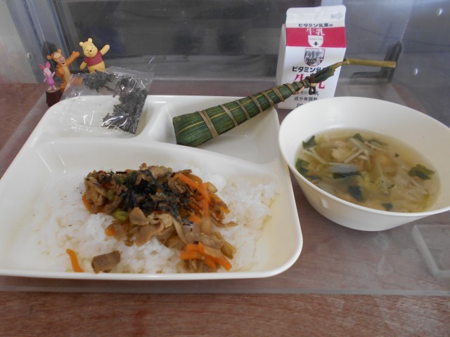 今日の給食は、きんぴらちらし、きざみのり、五目汁、ちまきです。