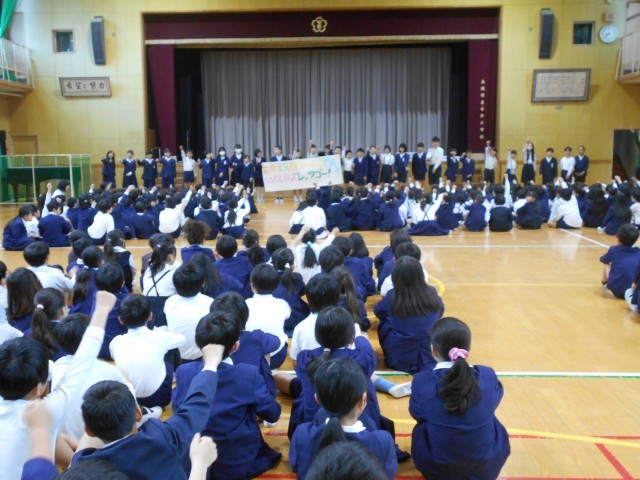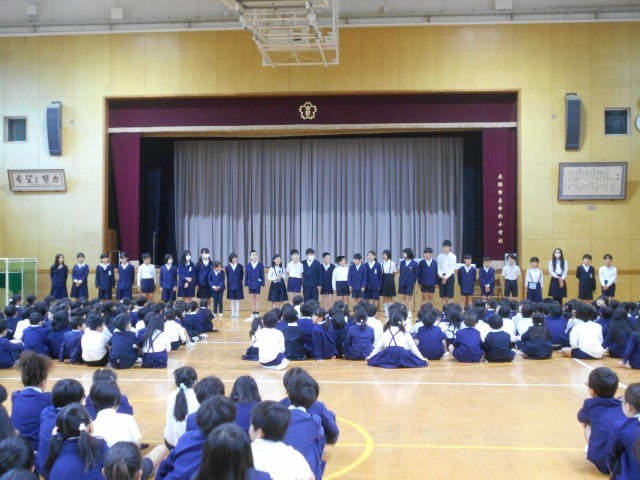 児童会からの発表があった後、みんなで声を合わせて今年のめあてを言いました。