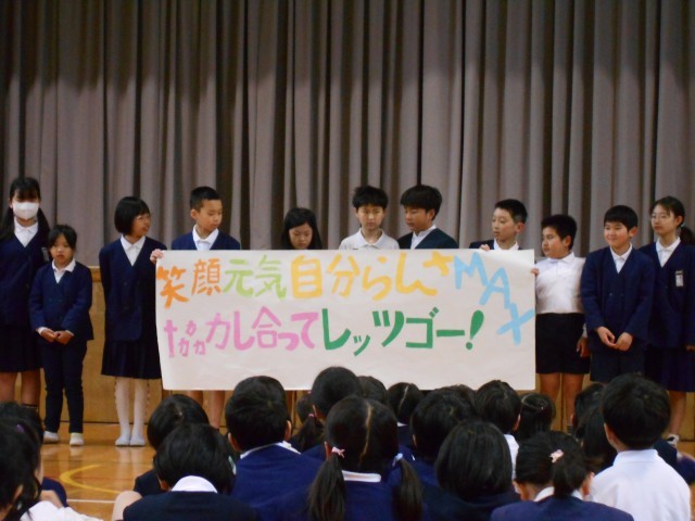 今日の児童集会は、児童会からめあて発表でした。