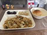 今日の給食は、オイスターソース焼きそば、もやしの中華あえ、ぶどう(巨峰)です。