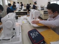 古タオルで雑巾を縫っています。学習したことを生かして針を刺したまま角まげて縫っ...