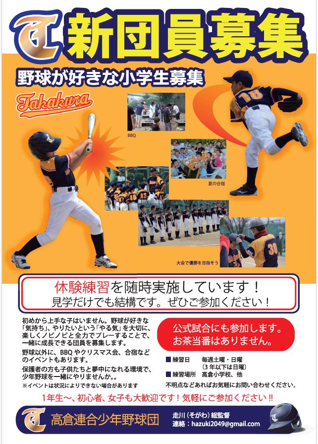 高倉連合少年野球団の新団員募集チラシ