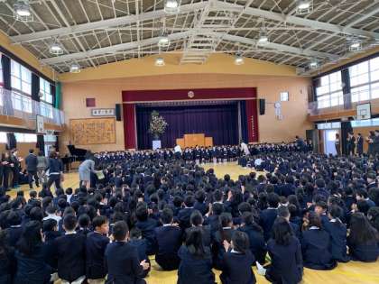 最後に1年生との対面式があり、拍手で迎えられながら、かわいい1年生たちが講堂に入場してきました。全学年の子どもたちが一堂に会しました。