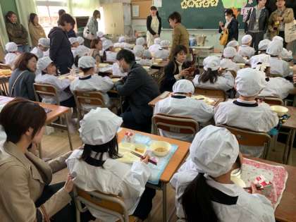 保護者の方々が見守る中、子どもたちはみんなとってもお行儀がよく、給食のルールをきちんと守っておいしそうに食べていました。