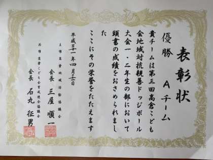4月22日(月)の児童朝会で、昨日実施された高倉地域対抗子ども会球技大会の表彰式を行いました。