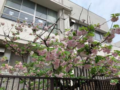 高倉小学校の周りには桜の木があり、今は八重桜が満開です。