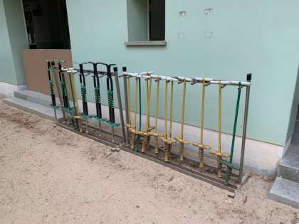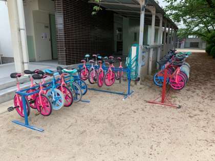 写真は本日の中庭にある一輪車・ホッピング・竹馬の様子です。