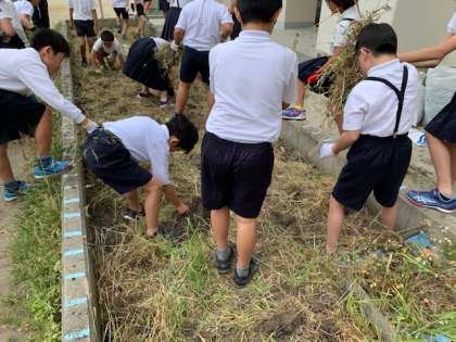5月14日(火)に5年生が田んぼの草ぬきをしました。みんなで力を合わせて行ったので、作業がはかどりました。