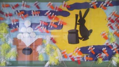 玄関の掲示板は秋景色です。大きなお月様にお供えしたお団子、うさぎ、たくさんの赤とんぼたち!