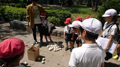 写真は上から、「タンバリンジャンプ」「いくつのせられるかな」「玉入れ」のようすです。みんなで力を合わせてがんばっています。