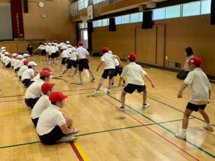講堂では反復横跳びや上体起こしなどを行っていますが、5年生が1年生の支援をしています。今回のように高学年が低学年の子どもたちにテストの方法を教えたり、回数をカウントしたりしており、低学年の子どもたちは安心してテストを受けることができます。