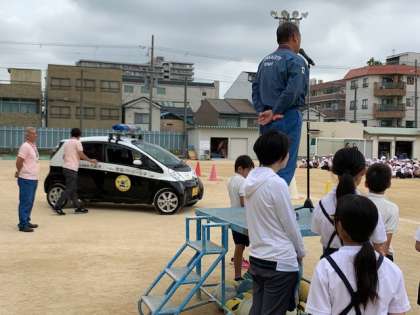 運動場に集まった子どもたちの前に青色パトロールカーが登場し、区役所の方から「5つのやくそく」についてお話をしていただきました。