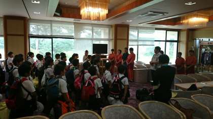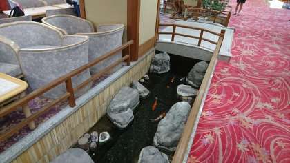 志摩ビーチホテルに到着しました。開舎式を行って避難訓練、地引き網体験と続きます。宿舎内に鯉が泳いでいるのを見て、「高級旅館や〜!」と歓声が上がっていました。