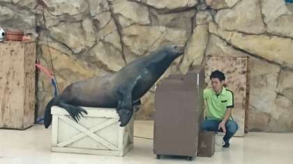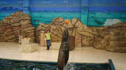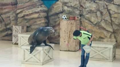 アシカショーが始まりました。昨夜のセミナーで、アシカがお客さんの前で演技を披露するのに5年くらいかかると聞いていたので、みんな一つ一つの演技に大きな拍手をしていました。